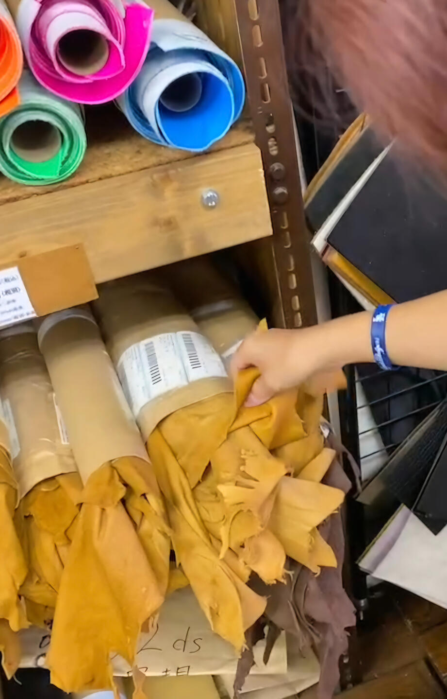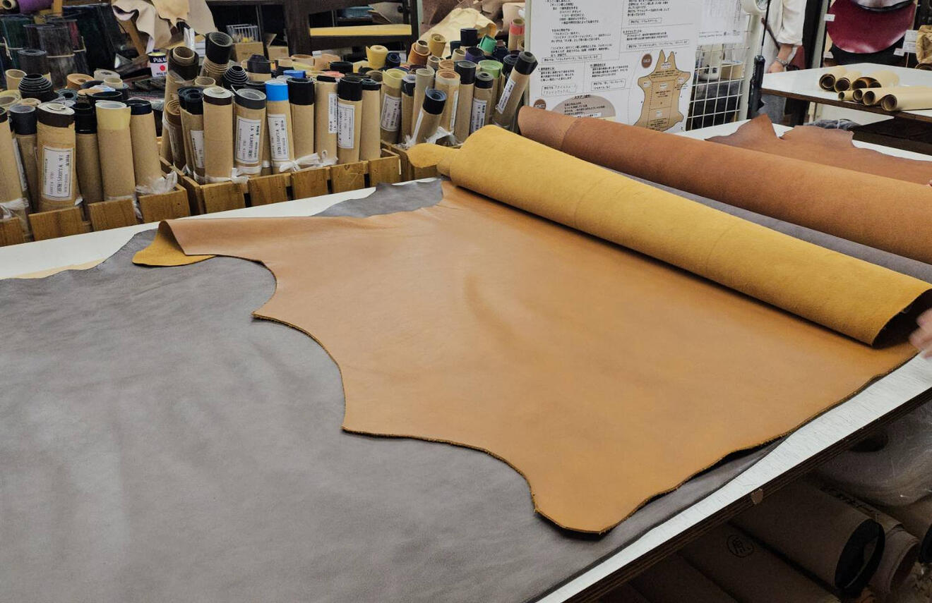浅草橋で革の卸を長きに渡り営んでいるお気に入りの業者さんのお店に足を運び、革の特性や質感に触れた上で、革のプロの方々と相談しながら、商品に最適な革を選んでいます。