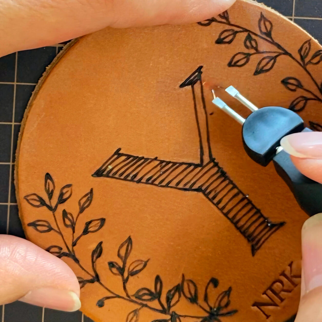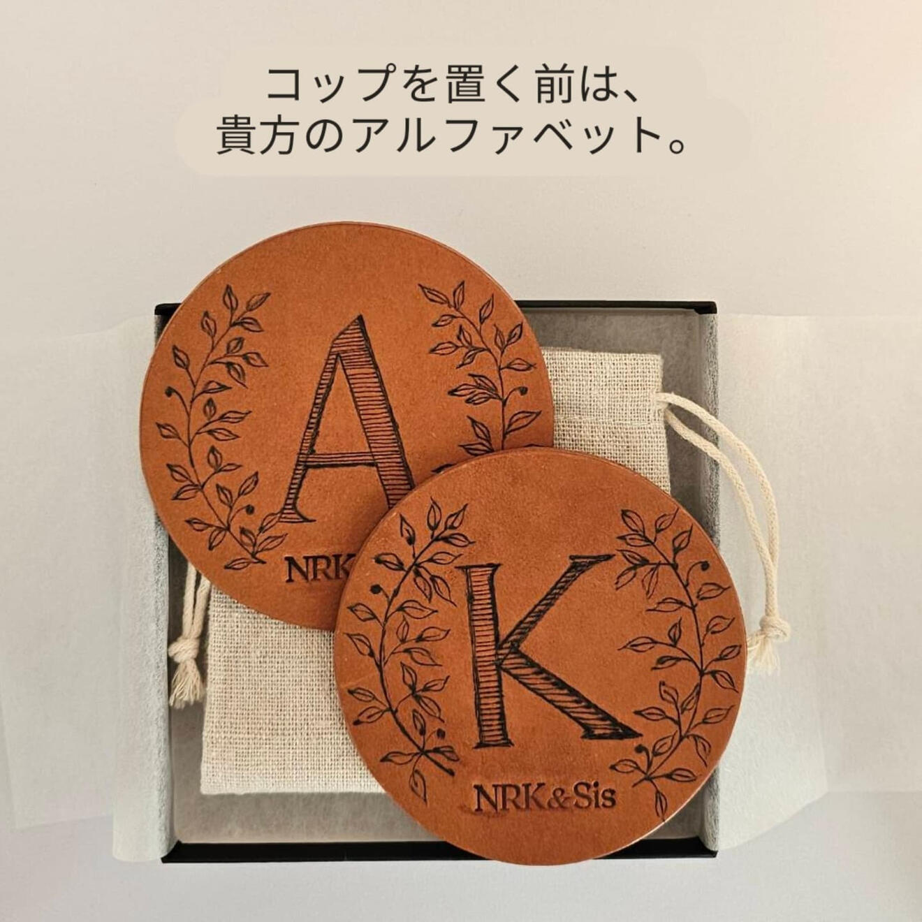 アルファベットを電熱ペンでフリーハンドで描いています。イニシャルを入れれば、あなただけのオリジナルコースターにもなります。